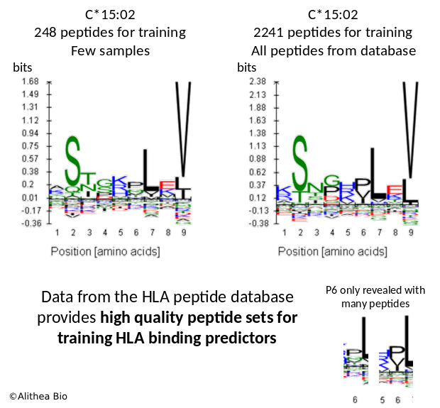 Alithea’s predictors are more accurate than those based on e.g. IEDB data because of the large dataset behind HLA-Compass. For example, HLA-Compass contains over 55k unique HLA A*02:01 peptides whereas IEDB includes around half of the total number of sequences. Especially for rare alleles (e.g. C*15:02 below) the number of peptides in HLA Compass is significantly higher than in IEDB or in monoallelic cell line data publicly available.