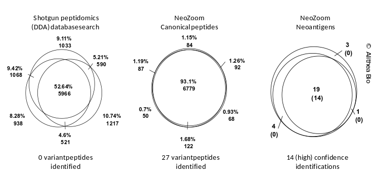 Alithea’s NEOZOOM™ strategy was developed to increase sensitivity and detectability of neoepitopes and clearly outperforms classical strategies. It represents a multi-step bioinformatic strategy to detect high confidence variant peptides from thousands of potential 8-12mer neoantigens.